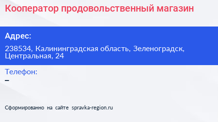 Кооператор, продовольственный магазин по адресу 238534, Калининградская область, Зеленоградск, Центральная, 24 в дальнейшем Организация, размещена в следующих категориях: