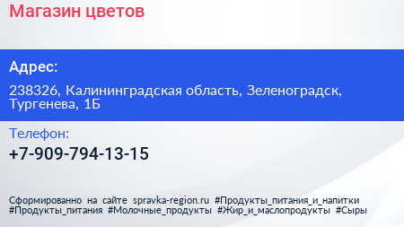 Магазин цветов по адресу 238326, Калининградская область, Зеленоградск, Тургенева, 1Б в дальнейшем Организация, размещена в следующих категориях: