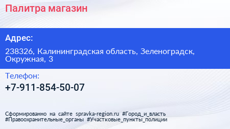Палитра, магазин по адресу 238326, Калининградская область, Зеленоградск, Окружная, 3 в дальнейшем Организация, размещена в следующих категориях: