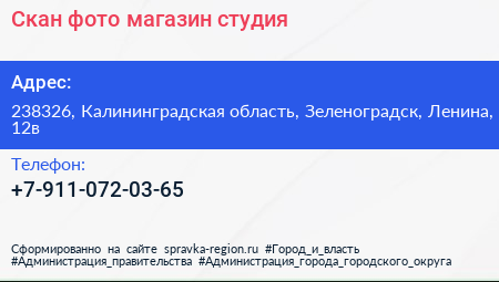 Скан-фото, магазин-студия по адресу 238326, Калининградская область, Зеленоградск, Ленина, 12в в дальнейшем Организация, размещена в следующих категориях: