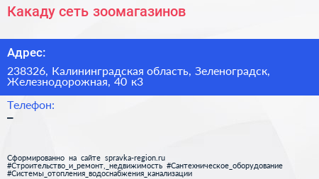 Какаду, сеть зоомагазинов по адресу 238326, Калининградская область, Зеленоградск, Железнодорожная, 40 к3 в дальнейшем Организация, размещена в следующих категориях: