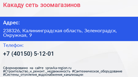 Какаду, сеть зоомагазинов по адресу 238326, Калининградская область, Зеленоградск, Окружная, 9 в дальнейшем Организация, размещена в следующих категориях: