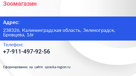 Зоомагазин по адресу 238326, Калининградская область, Зеленоградск, Бровцева, 16г в дальнейшем Организация, размещена в следующих категориях: