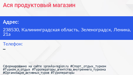 Ася, продуктовый магазин по адресу 238530, Калининградская область, Зеленоградск, Ленина, 21а в дальнейшем Организация, размещена в следующих категориях: