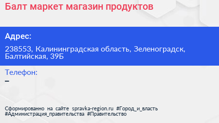 Балт маркет, магазин продуктов по адресу 238553, Калининградская область, Зеленоградск, Балтийская, 39Б в дальнейшем Организация, размещена в следующих категориях: