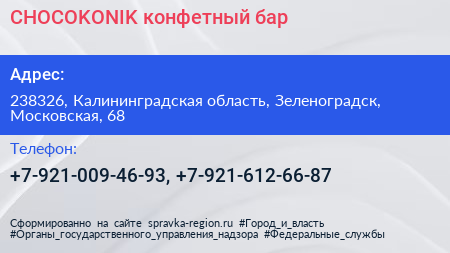 CHOCOKONIK, конфетный бар по адресу 238326, Калининградская область, Зеленоградск, Московская, 68 в дальнейшем Организация, размещена в следующих категориях: