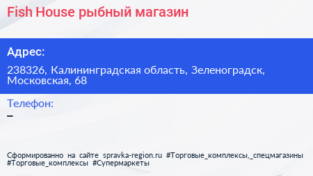 Fish House, рыбный магазин по адресу 238326, Калининградская область, Зеленоградск, Московская, 68 в дальнейшем Организация, размещена в следующих категориях: