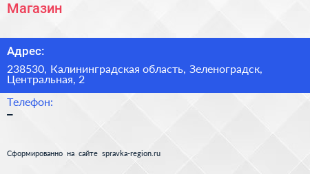 Магазин по адресу 238530, Калининградская область, Зеленоградск, Центральная, 2 в дальнейшем Организация, размещена в следующих категориях: