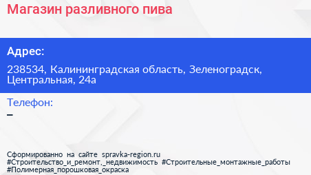 Магазин разливного пива по адресу 238534, Калининградская область, Зеленоградск, Центральная, 24а в дальнейшем Организация, размещена в следующих категориях: