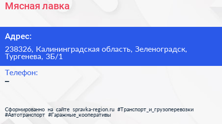 Мясная лавка по адресу 238326, Калининградская область, Зеленоградск, Тургенева, 3Б/1 в дальнейшем Организация, размещена в следующих категориях: