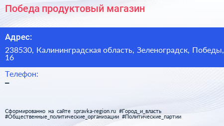 Победа, продуктовый магазин по адресу 238530, Калининградская область, Зеленоградск, Победы, 16 в дальнейшем Организация, размещена в следующих категориях: