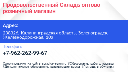 Продовольственный Складъ, оптово-розничный магазин по адресу 238326, Калининградская область, Зеленоградск, Железнодорожная, 10а в дальнейшем Организация, размещена в следующих категориях: