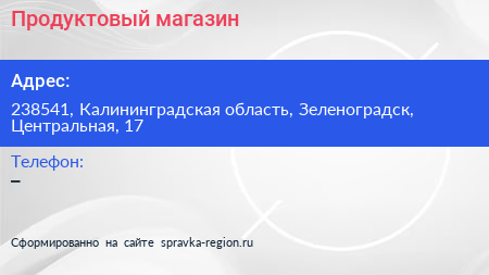 Продуктовый магазин по адресу 238541, Калининградская область, Зеленоградск, Центральная, 17 в дальнейшем Организация, размещена в следующих категориях: