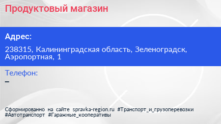 Продуктовый магазин по адресу 238315, Калининградская область, Зеленоградск, Аэропортная, 1 в дальнейшем Организация, размещена в следующих категориях: