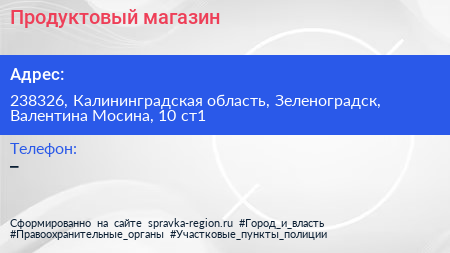 Продуктовый магазин по адресу 238326, Калининградская область, Зеленоградск, Валентина Мосина, 10 ст1 в дальнейшем Организация, размещена в следующих категориях: