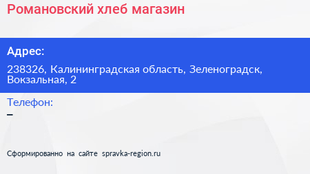 Романовский хлеб, магазин по адресу 238326, Калининградская область, Зеленоградск, Вокзальная, 2 в дальнейшем Организация, размещена в следующих категориях: