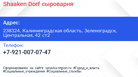 Shaaken Dorf, сыроварня по адресу 238324, Калининградская область, Зеленоградск, Центральная, 42 ст2 в дальнейшем Организация, размещена в следующих категориях: