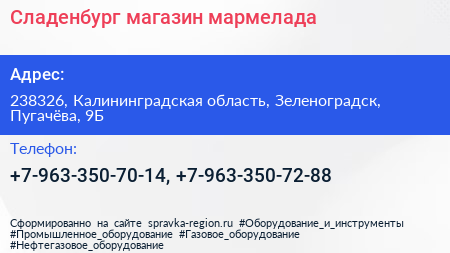 Сладенбург, магазин мармелада по адресу 238326, Калининградская область, Зеленоградск, Пугачёва, 9Б в дальнейшем Организация, размещена в следующих категориях: