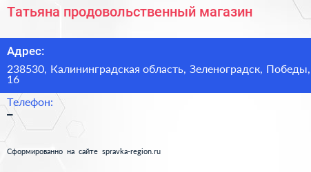 Татьяна, продовольственный магазин по адресу 238530, Калининградская область, Зеленоградск, Победы, 16 в дальнейшем Организация, размещена в следующих категориях: