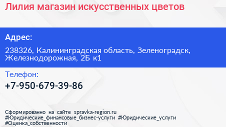 Лилия, магазин искусственных цветов по адресу 238326, Калининградская область, Зеленоградск, Железнодорожная, 2Б к1 в дальнейшем Организация, размещена в следующих категориях: