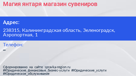 Магия янтаря, магазин сувениров по адресу 238315, Калининградская область, Зеленоградск, Аэропортная, 1 в дальнейшем Организация, размещена в следующих категориях: