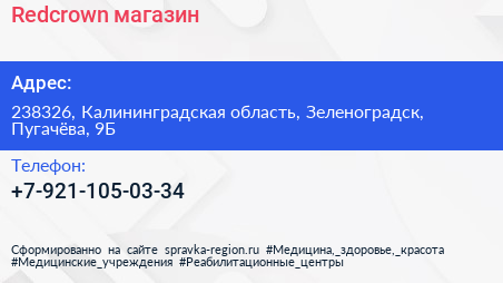 Redcrown, магазин по адресу 238326, Калининградская область, Зеленоградск, Пугачёва, 9Б в дальнейшем Организация, размещена в следующих категориях: