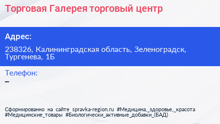 Торговая Галерея, торговый центр по адресу 238326, Калининградская область, Зеленоградск, Тургенева, 1Б в дальнейшем Организация, размещена в следующих категориях: