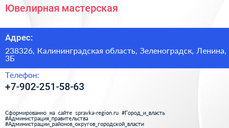 Ювелирная мастерская по адресу 238326, Калининградская область, Зеленоградск, Ленина, 3Б в дальнейшем Организация, размещена в следующих категориях: