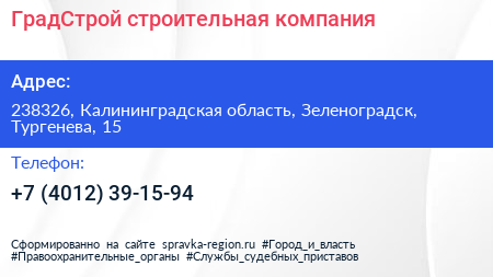 ГрадСтрой, строительная компания по адресу 238326, Калининградская область, Зеленоградск, Тургенева, 15 в дальнейшем Организация, размещена в следующих категориях: