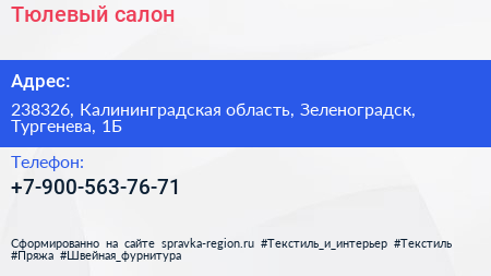 Тюлевый салон по адресу 238326, Калининградская область, Зеленоградск, Тургенева, 1Б в дальнейшем Организация, размещена в следующих категориях: