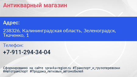Антикварный магазин по адресу 238326, Калининградская область, Зеленоградск, Ткаченко, 1 в дальнейшем Организация, размещена в следующих категориях: