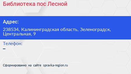 Библиотека, пос. Лесной по адресу 238534, Калининградская область, Зеленоградск, Центральная, 9 в дальнейшем Организация, размещена в следующих категориях: