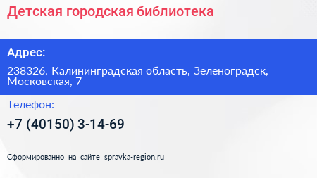 Детская городская библиотека по адресу 238326, Калининградская область, Зеленоградск, Московская, 7 в дальнейшем Организация, размещена в следующих категориях: