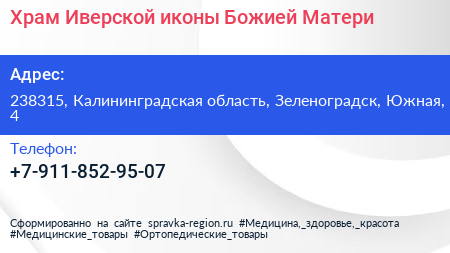 Храм Иверской иконы Божией Матери по адресу 238315, Калининградская область, Зеленоградск, Южная, 4 в дальнейшем Организация, размещена в следующих категориях: