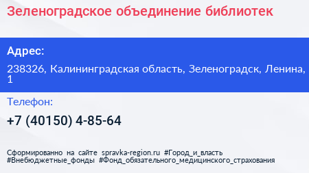 Зеленоградское объединение библиотек по адресу 238326, Калининградская область, Зеленоградск, Ленина, 1 в дальнейшем Организация, размещена в следующих категориях: