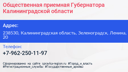 Общественная приемная Губернатора Калининградской области по адресу 238530, Калининградская область, Зеленоградск, Ленина, 20 в дальнейшем Организация, размещена в следующих категориях: