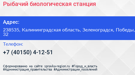 Рыбачий, биологическая станция по адресу 238535, Калининградская область, Зеленоградск, Победы, 32 в дальнейшем Организация, размещена в следующих категориях:
