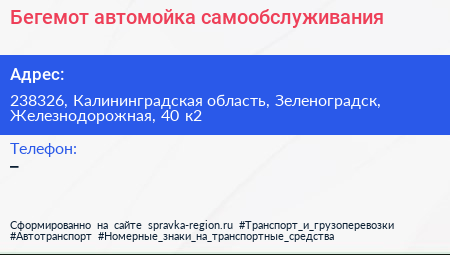 Бегемот, автомойка самообслуживания по адресу 238326, Калининградская область, Зеленоградск, Железнодорожная, 40 к2 в дальнейшем Организация, размещена в следующих категориях:
