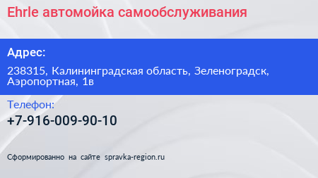 Ehrle, автомойка самообслуживания по адресу 238315, Калининградская область, Зеленоградск, Аэропортная, 1в в дальнейшем Организация, размещена в следующих категориях: