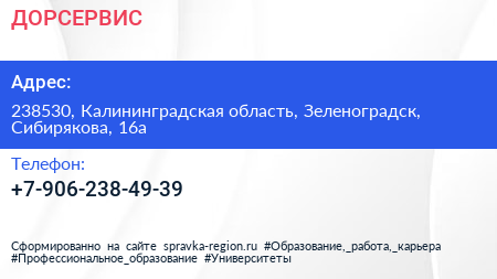 ДОРСЕРВИС по адресу 238530, Калининградская область, Зеленоградск, Сибирякова, 16а в дальнейшем Организация, размещена в следующих категориях: