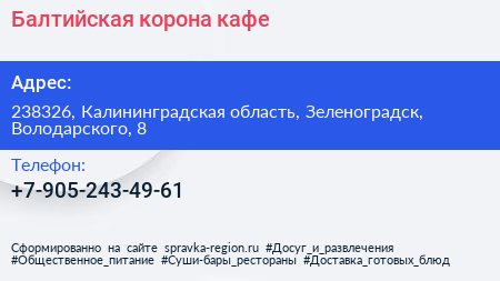 Балтийская корона, кафе по адресу 238326, Калининградская область, Зеленоградск, Володарского, 8 в дальнейшем Организация, размещена в следующих категориях: