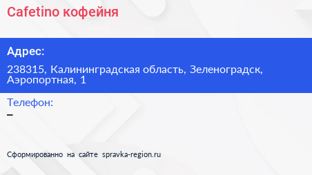 Cafetino, кофейня по адресу 238315, Калининградская область, Зеленоградск, Аэропортная, 1 в дальнейшем Организация, размещена в следующих категориях: