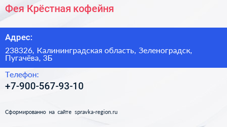 Фея Крёстная, кофейня по адресу 238326, Калининградская область, Зеленоградск, Пугачёва, 3Б в дальнейшем Организация, размещена в следующих категориях: