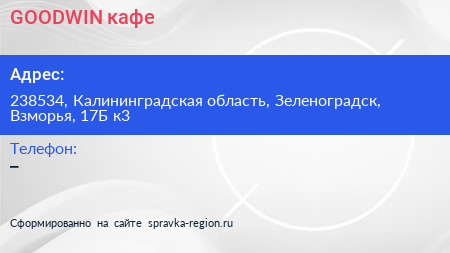 GOODWIN, кафе по адресу 238534, Калининградская область, Зеленоградск, Взморья, 17Б к3 в дальнейшем Организация, размещена в следующих категориях: