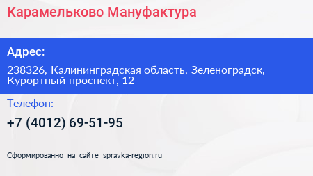 Карамельково Мануфактура по адресу 238326, Калининградская область, Зеленоградск, Курортный проспект, 12 в дальнейшем Организация, размещена в следующих категориях: