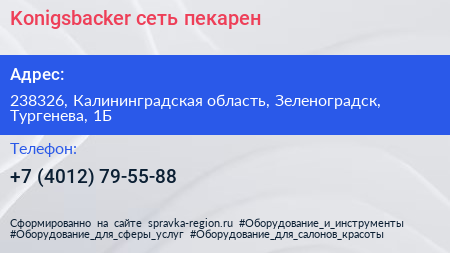 Konigsbacker, сеть пекарен по адресу 238326, Калининградская область, Зеленоградск, Тургенева, 1Б в дальнейшем Организация, размещена в следующих категориях: