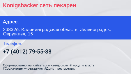 Konigsbacker, сеть пекарен по адресу 238326, Калининградская область, Зеленоградск, Окружная, 15 в дальнейшем Организация, размещена в следующих категориях:
