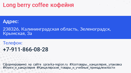 Long berry coffee, кофейня по адресу 238326, Калининградская область, Зеленоградск, Крымская, 3а в дальнейшем Организация, размещена в следующих категориях: