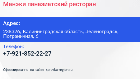 Манэки, паназиатский ресторан по адресу 238326, Калининградская область, Зеленоградск, Пограничная, 6 в дальнейшем Организация, размещена в следующих категориях: