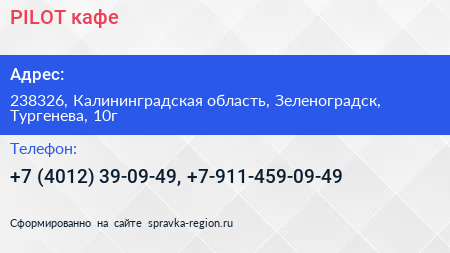 PILOT, кафе по адресу 238326, Калининградская область, Зеленоградск, Тургенева, 10г в дальнейшем Организация, размещена в следующих категориях: